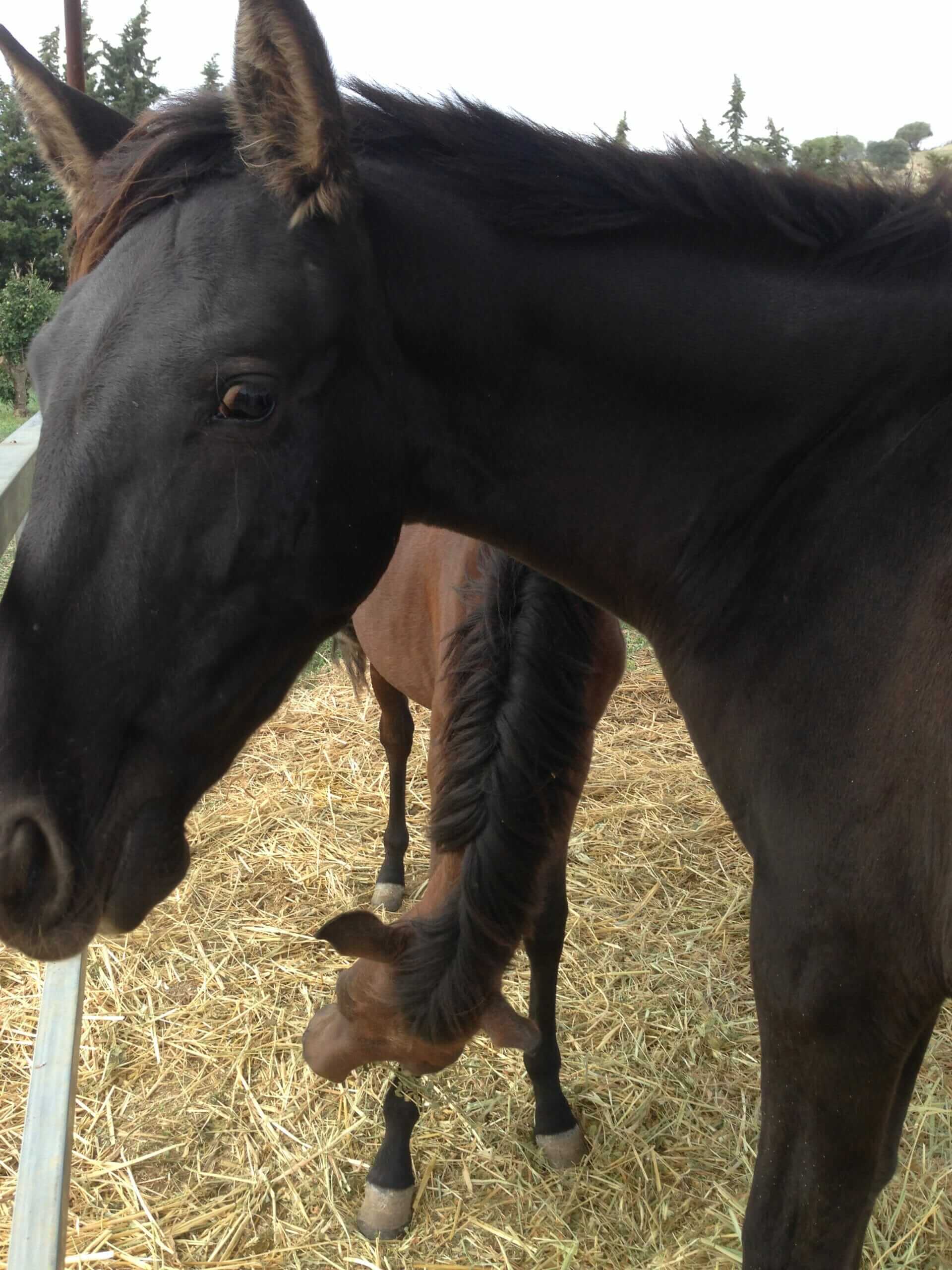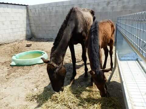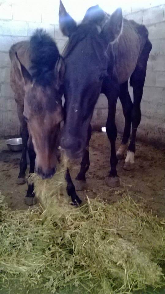 Pedro and Rubina have been only a few months old when we found them. They were so thin, that we were afraid that they wouldn't make it. Pedro was very weak but seemed to protect Rubina. As we found them Rubina was trying to get some milk from Pedro out of hungry desperation. She couldn't eat the grains she has been given, because she still has been a baby with baby teeth. They were standing in stable, we would call a dark hole. As we led them out to the truck they had to blink, because of the sunlight they weren't used to. So the first thing we did was to give them infusions, so that their kidneys won't fail. There new home had a bed of straw on the ground. Pedro immediately lay down. it seemed like he didn't know if he was allowed to lie down. It took him a few days to realize that he doesn't have to be afraid for his or Rubina's sake anymore. While he started to relax and eating the appropiate food, we found out that his nose was broken, which made it hard for him to breathe properly - and his hip was broken a few times, but was never fixed. Now both are completely healthy and happy again. Rubina is a little stubborn and feisty girl, Pedro on the other hand is very calm and reliable. And they should stay together as long as they live.